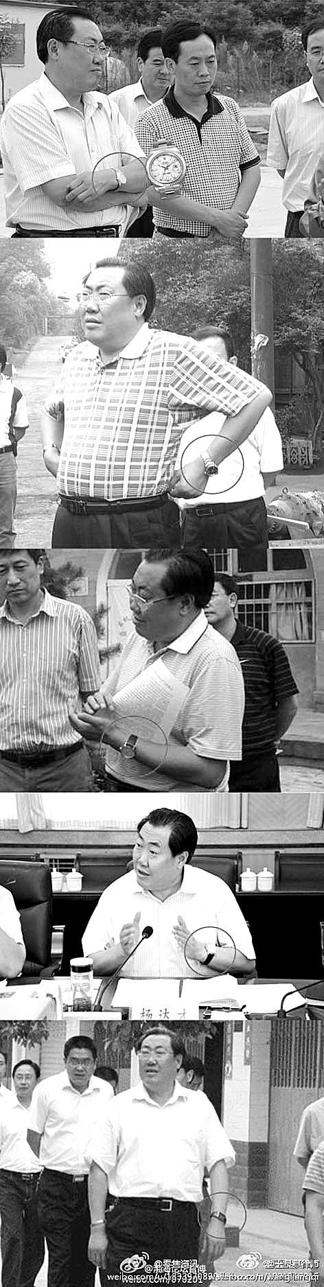 人肉搜索的大幕隨即開啟。當日19時53分,網友“百姓大于天”在其微博爆料稱,涉事官員為時任陜西省安監局局長楊達才。22時29分,網友“衛莊”在其微博發布了一張楊達才佩戴手表的照片,并稱“網友懷疑是價值3.8萬多歐元的歐米茄”。23時57分,渤海論壇的新浪官方微博發布了楊達才在不同場合佩戴有5塊不同款式手表的照片,稱這是“陜西省安監局局長楊達才同志的愛好”。8月27日18時12分,第五大道奢侈品網首席運營官孫多菲在其微博中稱:“我已向表行業內專家請教:第一張:6.5萬元左右的蠔式恒動系列勞力士;第二張:3.4萬元至3.5萬元之間的歐米茄;第三張:江詩丹頓18K玫瑰金表殼,而且是機械的,市場估計在20萬元至40萬元;第四張:歐米茄,價格也就3萬多元到4萬元;第五張:雷達全陶瓷,市值估計3萬元。”這條微博被轉發14531次,引發評論5350條。楊達才因此也被網民戲稱為“表哥”。