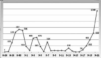 “楊達才事件”微博傳播日變化趨勢圖 (單位:篇數 數據來源:新浪微博)