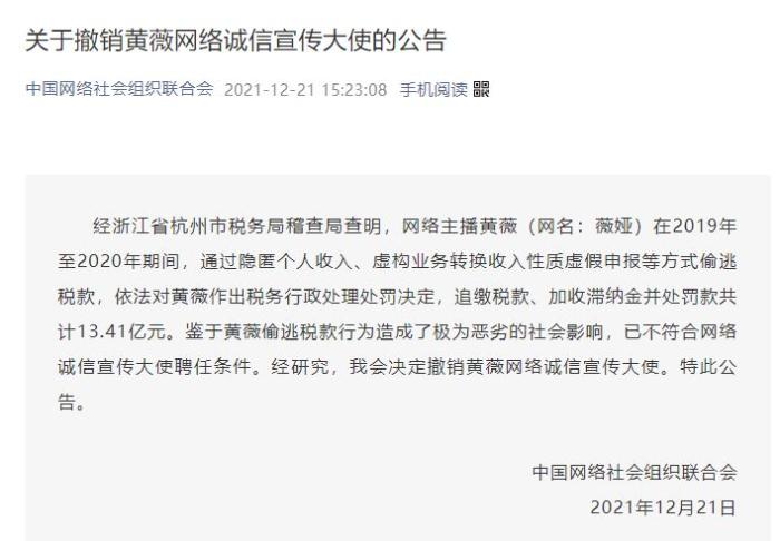 中新網(wǎng)12月21日電 據(jù)中國(guó)網(wǎng)絡(luò)社會(huì)組織聯(lián)合會(huì)微信公眾號(hào)消息,經(jīng)浙江省杭州市稅務(wù)局稽查局查明,網(wǎng)絡(luò)主播黃薇(網(wǎng)名:薇婭)在2019年至2020年期間,通過隱匿個(gè)人收入、虛構(gòu)業(yè)務(wù)轉(zhuǎn)換收入性質(zhì)虛假申報(bào)等方式偷逃稅款,依法對(duì)黃薇作出稅務(wù)行政處理處罰決定,追繳稅款、加收滯納金并處罰款共計(jì)13.41億元。鑒于黃薇偷逃稅款行為造成了極為惡劣的社會(huì)影響,已不符合網(wǎng)絡(luò)誠(chéng)信宣傳大使聘任條件。經(jīng)研究,中國(guó)網(wǎng)絡(luò)社會(huì)組織聯(lián)合會(huì)決定撤銷黃薇網(wǎng)絡(luò)誠(chéng)信宣傳大使。