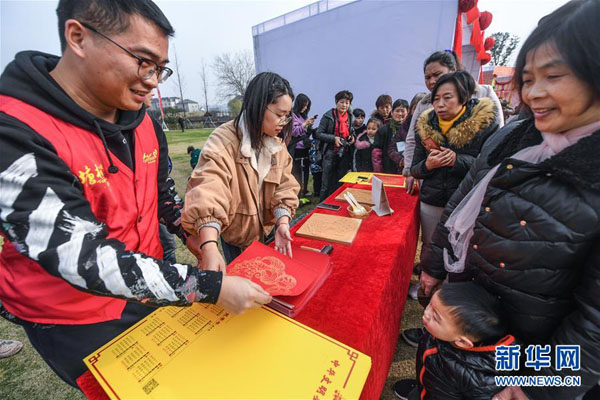 1月5日,工作人員在游園會活動現場為群眾印制分發新春年歷。當日,浙江省杭州市余杭區塘棲村舉辦迎新春“幸福游園會”,內容包括重現不同年代結婚場景、慶豐收甘蔗運動會、傳統美食制作、趣味游戲等,讓當地百姓在幸福歡樂的氣氛中迎接即將到來的新春佳節,同時也感受家鄉發展帶來的新變化。