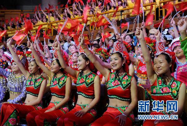 6月30日晚,一些少數(shù)民族學(xué)生在大型文藝晚會(huì)《唱支山歌給黨聽(tīng)》中揮舞黨旗,為精彩演出加油助威。當(dāng)日,為慶祝中國(guó)共產(chǎn)黨成立90周年,云南省精心策劃的大型文藝晚會(huì)《唱支山歌給黨聽(tīng)》在昆明市體育館舉行。該晚會(huì)以紅色經(jīng)典為主線,結(jié)合云南獨(dú)特的少數(shù)民族風(fēng)情,運(yùn)用獨(dú)唱、合唱、舞蹈、朗誦等多種藝術(shù)形式和聲光電等技術(shù)手段,謳歌中國(guó)共產(chǎn)黨90年的光輝歷程和豐功偉績(jī)。新華社記者 藺以光 攝