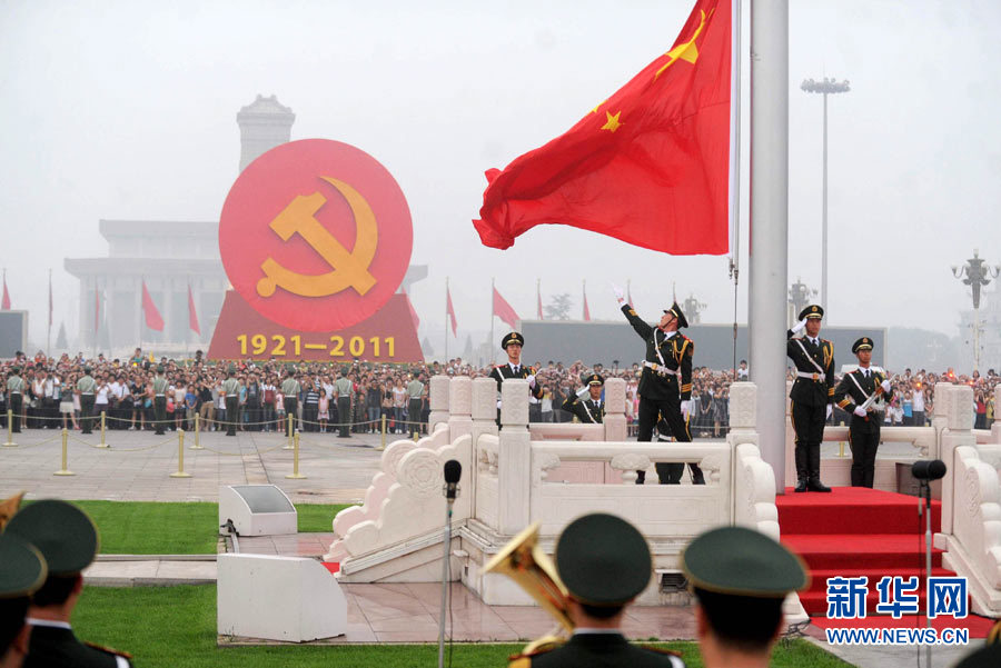 7月1日,國旗護衛隊戰士護送國旗走向升旗臺。當日,來自全國各地的數萬名群眾匯聚北京天安門廣場,觀看隆重的升旗儀式,紀念中國共產黨成立90周年。 新華社記者 羅曉光 攝