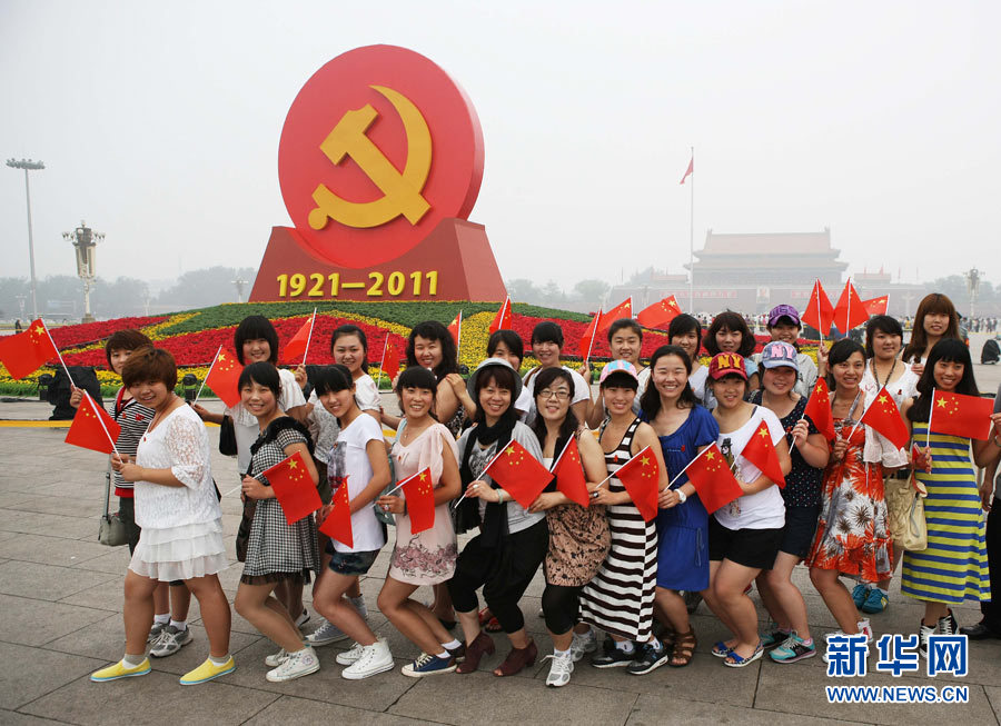 7月1日,一隊游客在廣場“紅心向黨”花壇前合影。當日,來自全國各地的數萬名群眾匯聚北京天安門廣場,觀看隆重的升旗儀式,紀念中國共產黨成立90周年。 新華社發(李方宇 攝)