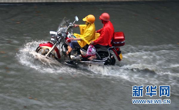 7月3日,兩名市民在成都市武侯區(qū)長(zhǎng)壽南路的積水路段騎車(chē)前行。新華社發(fā)(薛玉斌 攝)