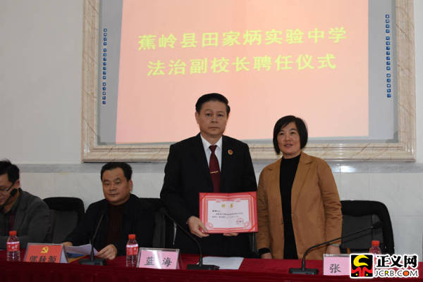 正義網梅州1月2日電(通訊員李紅梅 丘媛鈺)近日,廣東省蕉嶺縣田家炳實驗中學舉行“法治副校長”聘任儀式暨法治宣講活動,廣東省蕉嶺縣檢察院檢察長藍海接過縣教育局局長張慧頒發的聘書,成為蕉嶺縣田家炳實驗中學法治副校長。