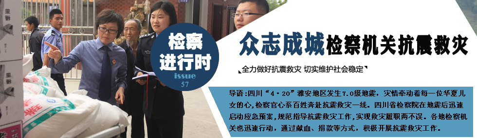 “4.20“雅安蘆山地震發生后,四川各級檢察院通過“流動辦案組”、發出檢察建議等方式,履行檢察職能,規范指導抗震救災工作,維護災區社會穩定,實現救災履職兩不誤。