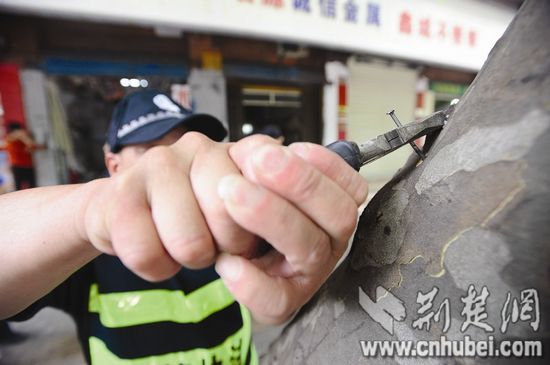 原來,上個月,店老板段某在門前人行道的法桐樹上釘了顆釘子,用來晾曬拖把。該區城管發現后,先對其進行提醒,后又送來《限期整改通知書》,但段一直沒在意。直到昨日接到罰單,他才一臉驚訝:“看來這次是動真格的!”