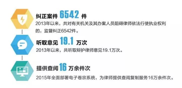 高度重視律師在促進司法公正中的重要作用。2014年12月,最高檢制定依法保障律師執業權利的規定。2015年9月,“兩高三部”發布依法保障律師執業權利的規定。2013年以來,全國檢察機關對有關機關及其辦案人員阻礙律師依法行使執業權利的,監督糾正6542件。