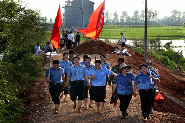 2012年6月,江西省豐城市清豐山河段潭鄉流域發現嚴重險情,豐城市人民檢察院迅速調集院應急小分隊與段潭鄉干部群眾一起參與防汛工作。圖為險情排除后干警凱旋歸來的情景。