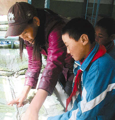 白瑪德吉(左)在幫助住校的牧民孩子整理被褥。新華社發