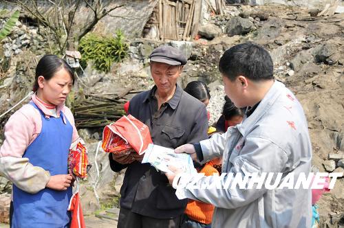 “背篼干部”們來到斗麻村達海組,給村民們發放種子和禁毒宣傳資料等。新華社記者 王駿勇 攝
