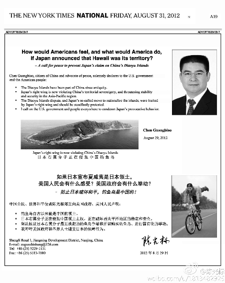 這則刊于8月31日《紐約時報》A19版上的半版廣告,以中英文兩種語言刊出,標題直接反問美國讀者:“如果日本宣布夏威夷是日本領土,美國人民會有什么感受?美國政府會有什么舉動?”“防止日本人破壞和平,釣魚島是中國的!”全文內容為:“中國公民、世界和平使者陳光標鄭重向美國政府、美國人民聲明:釣魚島自古以來就是中國的領土。日本右翼分子正在侵犯中國領土主權,正在破壞西太平洋地區的穩定和安全。堅決抗議日本右翼分子最近挑起的釣魚島爭端和所謂購買釣魚島、進行國有化的舉動。我呼吁美國政府和各界人士譴責日本的挑釁行為!甭淇钐庍附上了郵箱“zuguozhishang@126.com”,用戶名即為“祖國至上”的拼音。