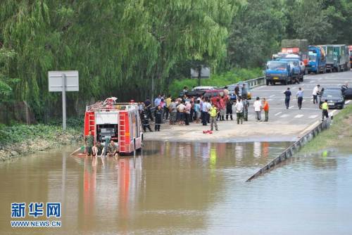 指揮人員:就是京石高速的皇冠屯這,當時通知說有一輛大巴,是三洲青島的中青旅游公司的車被淹,車里面有一百多人。我們在將近一點的時候趕到現場,隊員乘坐橡皮舟摸黑過去到前方將近500米以后,什么也看不到,搜尋不到目標。兩點左右,我們又跟北京市藍天救援隊聯系,他們過來4名潛水隊員,和我們一起乘坐橡皮舟進去搜尋。