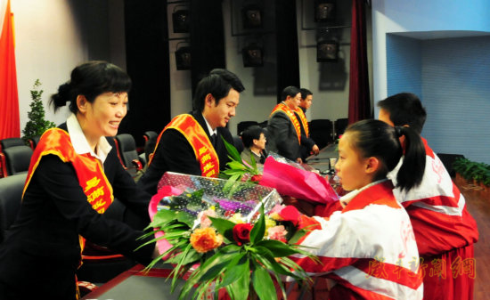 少先隊員為報告團(tuán)成員敬獻(xiàn)鮮花