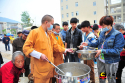 蘆山縣佛圖寺的僧侶們每天早上8點到晚上8點,不間斷的在縣人們醫院門前免費為路人提供熱粥。正義網記者程丁/攝