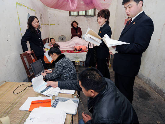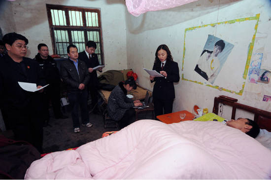 開庭當天,檢察官、法官帶領著書記員、法警冒著嚴寒來到被告人家中,在被告人的病床邊完成了案件庭審。高剛 攝