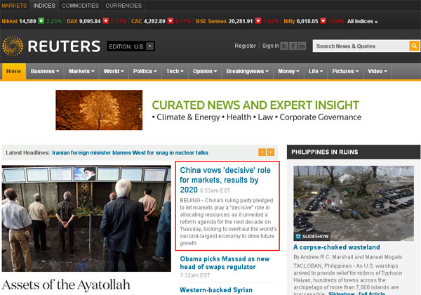 英國路透社網站頭版頭條報道:中國共產黨11月12日公布了未來10年的改革計劃,提出讓市場在資源配置中起“決定性”作用,希望帶領這個世界第二大經濟體在未來持續增長。
