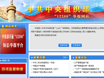 中組部12月正式開通了“12380”短信舉報平臺,形成了信件、電話、網絡、短信“四位一體”的“12380”綜合舉報受理平臺,主要受理反映違規違紀選人用人問題的舉報。
