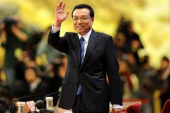 >3月13日上午,十二屆全國人大二次會議舉行閉幕會,大會閉幕后,國務院總理李克強在人民大會堂金色大廳與中外記者見面并回答記者提問。圖為國務院總理李克強向記者揮手致意。