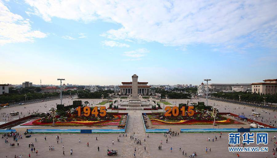 8月26日拍攝的天安門廣場(chǎng)長(zhǎng)城主題花壇。 8月26日零時(shí),北京市花木有限公司承建的天安門廣場(chǎng)紀(jì)念抗戰(zhàn)勝利70周年花卉全部布置完畢。此次天安門廣場(chǎng)花卉布置主要包括四個(gè)方面:人民英雄紀(jì)念碑周邊的檜柏花帶、人民英雄紀(jì)念碑北側(cè)的長(zhǎng)城主題花壇、廣場(chǎng)內(nèi)東西兩塊綠地的花柱、花球、花帶以及廣場(chǎng)東西側(cè)路的花缽80組。其中長(zhǎng)城主題花壇總占地3000平方米,兩組花壇每組東西長(zhǎng)60米,南北寬25米,使用龍柏、葉子花、油松等大型植物3000株,小型花卉7萬盆、景觀石及仿真景觀石1200平方米。 新華社記者 殷剛 攝 圖片來源:新華網(wǎng)