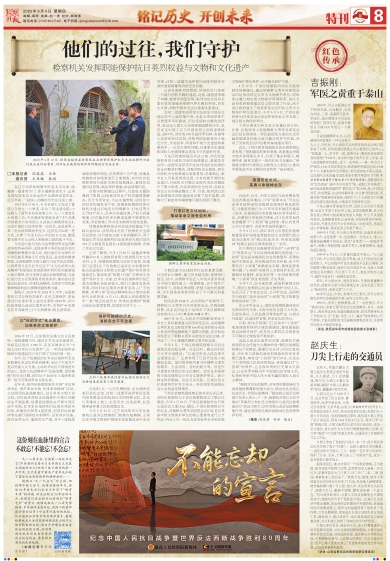 八十年歲月鎏金,八十年精神永續。當時光的指針走向中國人民抗日戰爭暨世界反法西斯戰爭勝利80周年之際,那段山河浴血、眾志成城的壯闊史詩,依然在時光長河中激蕩著震撼人心的力量。回望烽火,聚焦當下,檢察日報正義網推出大型融媒體專題,記錄那些銘記抗戰歷史、守護抗戰記憶、傳承抗戰精神的檢察身影和法治足跡。