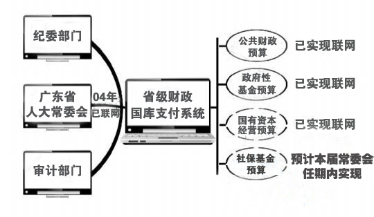 2004年,廣東省人大財經委實現了與省財政廳國庫集中支付系統聯網,廣東在全國率先實現省級公共財政預算支出聯網監督。2010年,省級和21個地級以上市全部實現了人大財經委與財政部門、審計部門的聯網,此外,廣東省人大常委會不斷拓展預算聯網監督覆蓋面,推進監督從公共財政預算資金、政府性基金預算資金擴大到國有資本經營預算資金和社保基金預算資金。