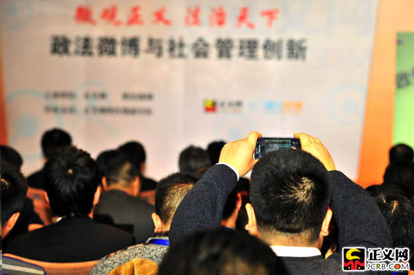 12月24日上午9時,由正義網與騰訊微博主辦的“政法微博與社會管理創新”峰會將在北京召開。與會嘉賓將就政法信息微博公開現狀、突發政法輿情微博應對機制、政法官員微博內容規范、微博問政與社會管理創新等問題進行探討。圖為現場嘉賓用手機拍攝,實況直播峰會動態。程丁/攝