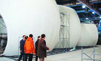 在山東館前,我們看見地面幾位工程師正在商量,上面的架子上幾位工人正在施工。王錦珍副會長向正在那里的施工負責人詢問進展情況,施工負責人回答說,我們施工進展很順利,這個月底就可以完工,并將很快轉入試運行。月底,省里的領導還將到這里來檢查。