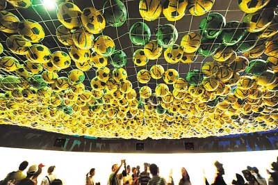說起足球怎么可能少了巴西?作為唯一一個“全勤”參加了所有世界杯決賽并且5次捧杯的世界頭號足球強國,自然不會放過在世博會上展示他們足球文化的機會。更何況下屆2014年世界杯時,巴西人將成為東道主。巴西館整個建筑猶如一個綠色“翻版鳥巢”,與足球有關(guān)的元素隨處可見。展館正面的外墻上安裝了一臺巨大的液晶顯示屏,播放足球游戲畫面。進入展館,游客首先將走進一個環(huán)形屏幕放映廳中,最吸引眼球的不是畫面精致的影片,而是你抬頭就能發(fā)現(xiàn)的驚喜——用數(shù)百個足球鋪就的天花板。在這里,館方在天花板上安裝了一張巨大的網(wǎng)兜,并在其中塞進了數(shù)百個綠色、白色、藍色、黃色的足球,這些顏色也是巴西國旗的組成色。這一設計讓參觀者一進入展廳便能感受到足球王國的魅力。