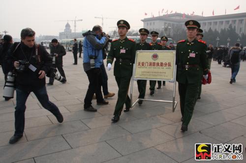 天安門消防執勤分隊的戰士們走進天安門廣場馬上吸引了外國記者的目光 本網記者孟澍菲攝