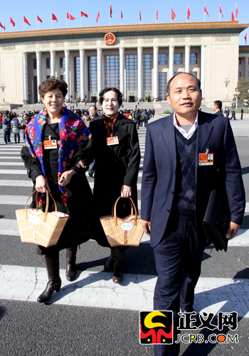 3月4日上午,十一屆全國人大四次會議召開預備會。浙江代表陳飛將帶來的環保籃送給兩位新疆代表。傅偉/攝