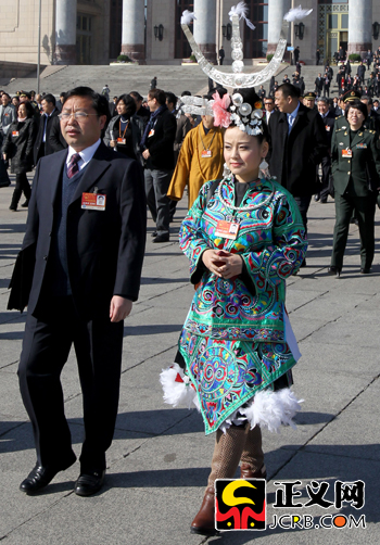 3月4日上午,十一屆全國人大四次會議召開預備會。貴州代表雷阿幼朵身著民族服裝走出會場。傅偉/攝