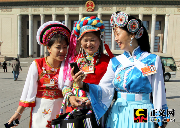 3月4日上午,十一屆全國人大四次會議召開預備會。三位少數民族代表在人民大會堂前欣賞用手機拍攝的留影照。傅偉/攝