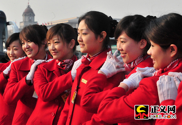 代表駐地的禮儀小姐為兩會增色添彩。靚麗的衣服和燦爛的笑容,使她們成為大會堂前一道靚麗的風景線。程丁/攝
