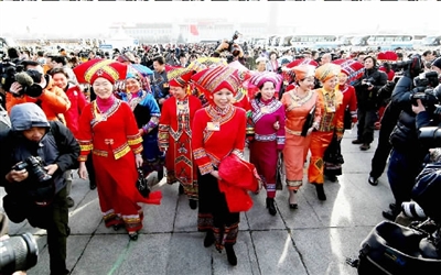 少數(shù)民族代表身著民族服裝步入會(huì)場。我國現(xiàn)行選舉法規(guī)定,人口特別少的民族至少應(yīng)有一名代表。國務(wù)院新聞辦去年9月27日發(fā)表的《中國的民族政策與各民族共同繁榮發(fā)展》白皮書顯示,我國歷屆全國人民代表大會(huì)中,少數(shù)民族代表人數(shù)占全國人民代表大會(huì)代表總?cè)藬?shù)的比例,均高于同期少數(shù)民族人口占全國總?cè)丝诘谋壤?/p>