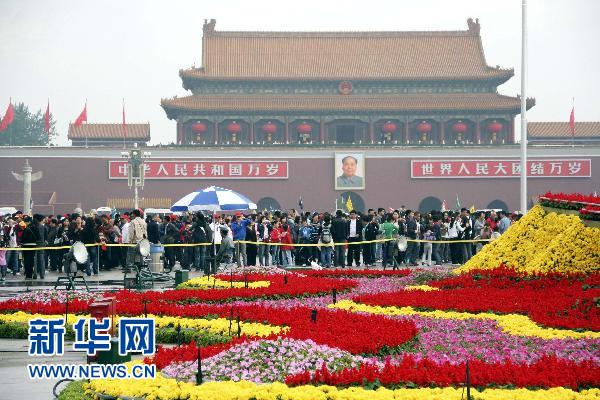 2010年10月2日,游客在北京天安門廣場游覽。當日,北京天氣晴好,天安門、故宮地區迎來如潮的游人。 新華社發(陳柏材 攝)