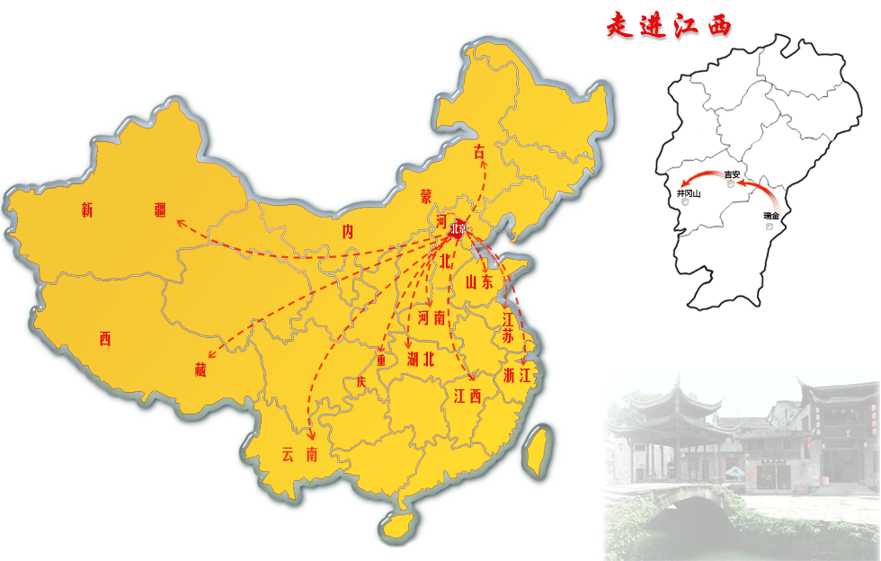 瑞金,位于江西省東南邊陲,因地產黃金,金為瑞,故名。江西瑞金是一片具有光榮革命歷史的紅土地。20世紀30年代,中國共產黨領導創建以瑞金為中心的中央革命根據地(中央蘇區)。井岡山既是一個旅游勝地,亦是一處革命圣地。從這里燃起的星星之火,后來蔓延成熊熊烈焰,最后紅遍了全中國。