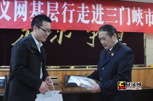 正義網記者向三門峽市檢察院檢察長張永鍵贈書。姚宇/攝