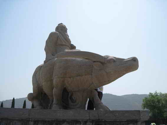 下了關樓,來到花崗巖砌成的“老子騎青牛”雕像前,很多人都會產生這樣的疑問:老子離關西去之后,去了哪里?這個問題一問千年,我也同樣好奇。據說圣人繼續西行至秦國歸隱山林,也有說他西行至昆侖山修道。但我寧愿相信圣人出關后,得道上天做了太上老君,他下臨萬民,造福靈寶百姓;他仙氣一呵,庇蔭寺河山的蘋果和后地的大棗;他道袖一揮,成就小秦嶺的金光燦燦。