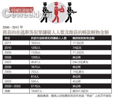 《中國經濟周刊》從最高檢歷年“兩會”上的工作報告整理得知,自2000年底最高檢會同公安部組織開展追逃專項行動以來,至2011年,檢察機關共抓獲在逃職務犯罪嫌疑人18487名。而據最高檢公開發布的2005、2007、2009—2011年五年的數據顯示,我國這五年共繳獲贓款贓物金額達到541.9億元。